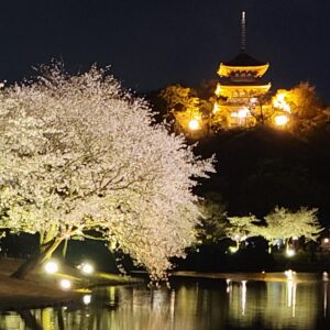 夜には、桜だけではなく、旧燈明寺三重塔をはじめとした歴史的建造物にも光を照らし、黄金色に光り輝く姿をご覧いただけます。