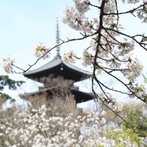 夜には、桜だけではなく、旧燈明寺三重塔をはじめとした歴史的建造物にも光を照らし、黄金色に光り輝く姿をご覧いただけます。