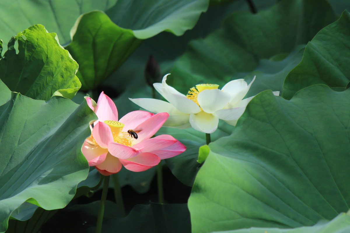 白蓮とピンクの蓮が寄り添う様に咲き始め、美の競演をご覧いただけます。