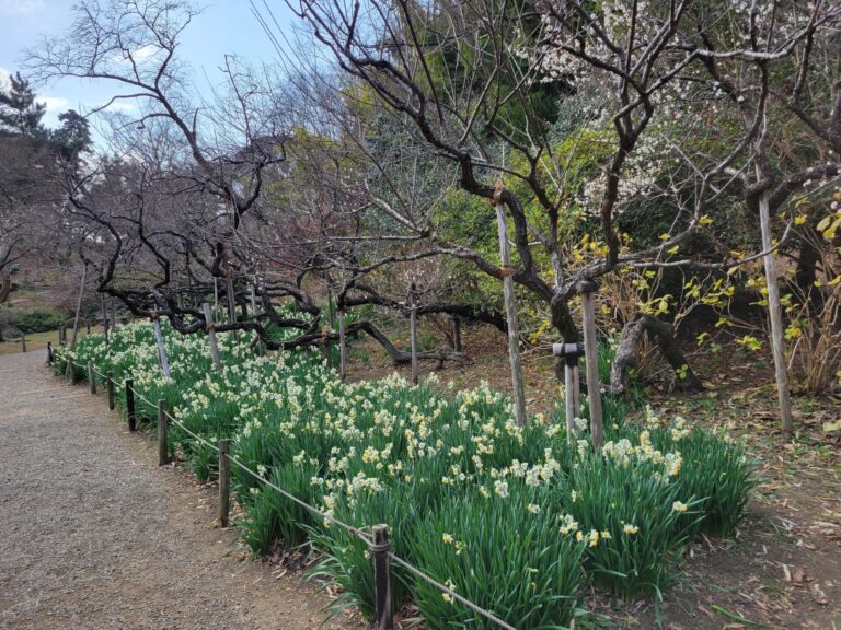 臥竜梅は遅咲きですが、少しずつ咲き始めています。スイセンは見ごろです。