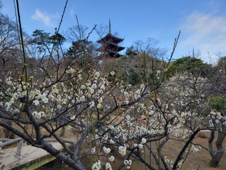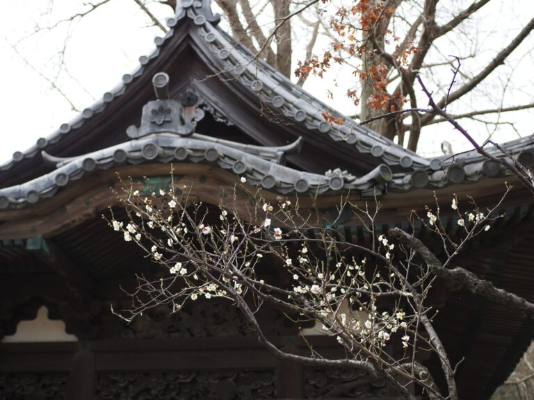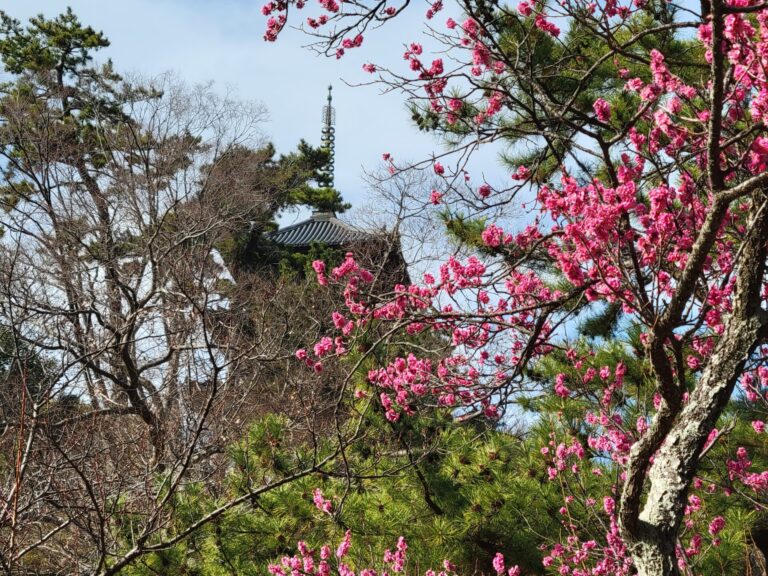 旧天瑞寺寿塔覆堂前の梅が咲き始めています。月華殿まわりの白梅はまだこれからです。