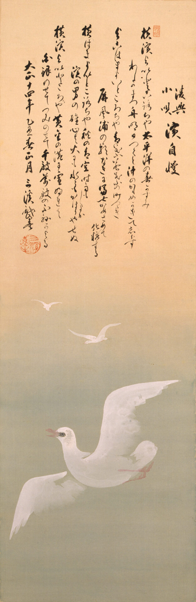 三溪園には以前からカモメの画にその歌詞を記した三溪自筆の作品が遺り、当時の新聞にはレコードも発売された旨の記事が確認されていたものの、その曲調など詳細は長年不明のままだった。そんな中、平成21(2009)年に市内の一愛好家により昭和5(1930)年の再録盤が、次いで23(2011)年には初録盤が発見され、話題となった。再録盤には作曲者として、開港期の横浜で発祥した日本舞踊の流派・七々扇(ななおうぎ)流二代目の家元・小橘(こきつ)の名の記載があった。
